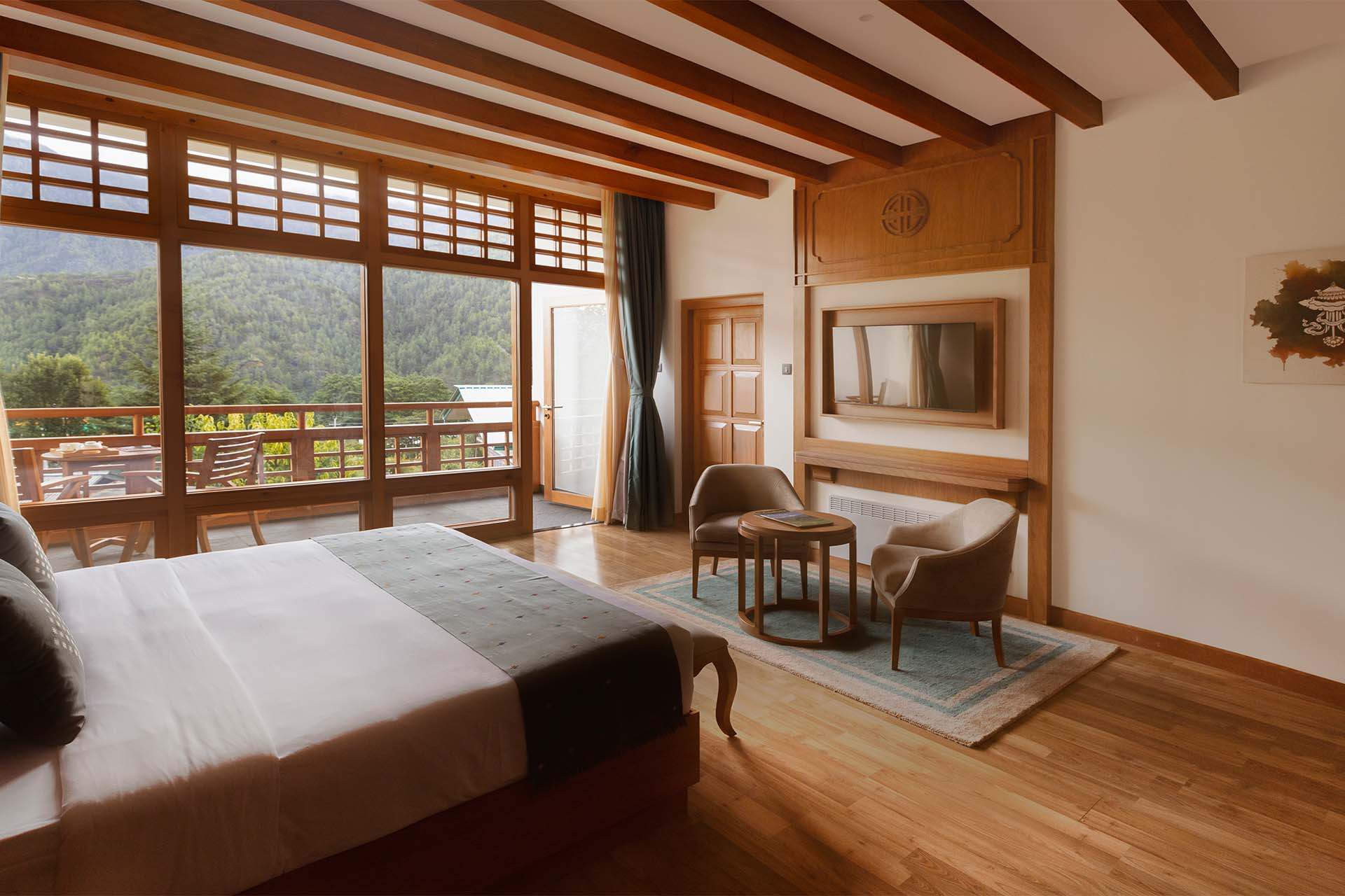 Experience refined comfort in our elegantly designed rooms, offering breathtaking views of Tiger’s Nest Monastery and the Paro Valley. Featuring contemporary interiors with clean wooden flooring, each room opens via sliding doors to a private balcony, creating a seamless blend between luxury and nature. Thoughtfully curated for modern travellers, our rooms include underfloor-heated bathrooms with granite and marble finishes, ultra-comfortable beds with premium linen, and high-speed Wi-Fi. A distinctive minibar experience includes French press coffee, fine wines, craft beers, and homemade snacks, ensuring a stay that is both indulgent and uniquely Amba Paro.